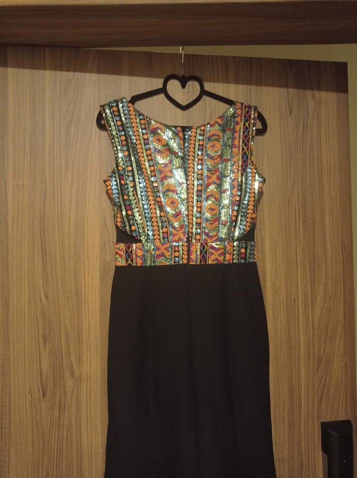 V yaka, kolsuz, kemerli, desenli üst kısmı ve koyu renk uzun etek kısmı ile bohem tarzda uzun, vücuda oturan elbise. Romantik akşamlar için uygun.