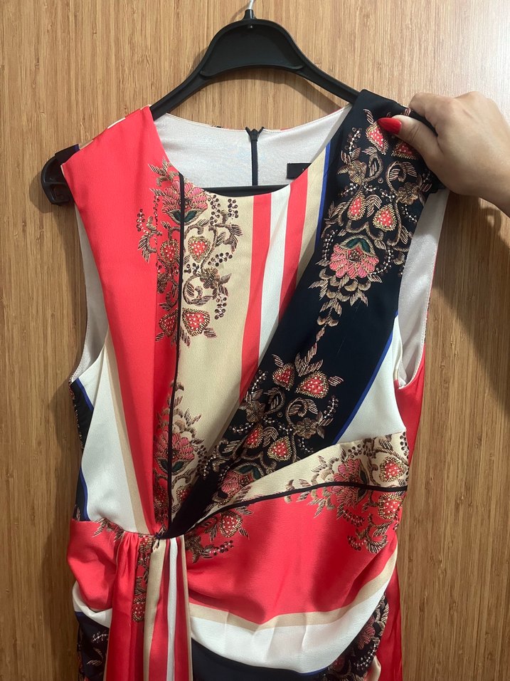 V yakalı, askısız, uzun ve vücuda oturan elbise. Canlı çok renkli desenli kumaş ve drapeli detaylara sahip bohem tarzda bir model.
