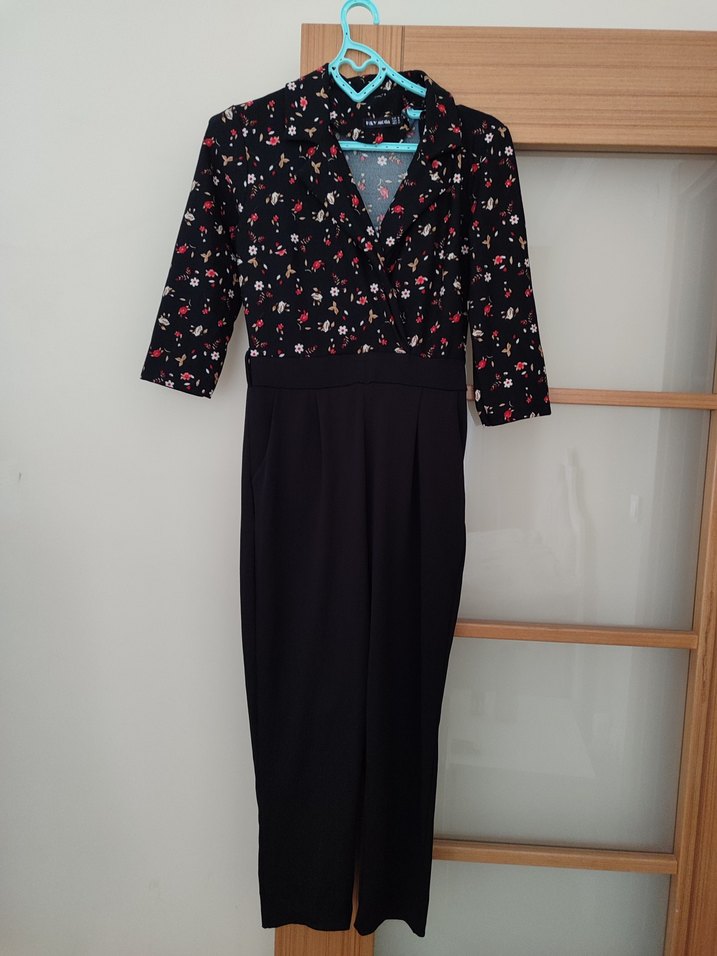 V yaka ve uzun kollu, üst kısmı çiçek desenli siyah tulum. Düğmeli ve yumuşak sentetik kumaştan, ofis için uygun. m beden herhangi bir kusuru yok.