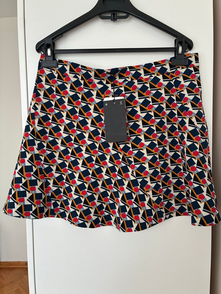 Sentetik kumaştan, volan detaylı ve bol kesimli, çok renkli desenli mini etek. Sokak modası için uygun.