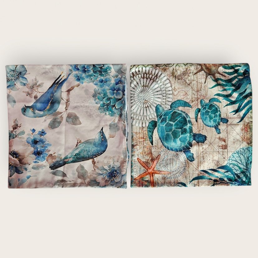 Baskılı desenlere sahip, mavi tonlarında kuş ve deniz kaplumbağası figürlü yastık kılıfları. Yastıklarınıza renk ve tema katmak için ideal. Fermuarlı, yeni. Boyutlar 42*42 cm.