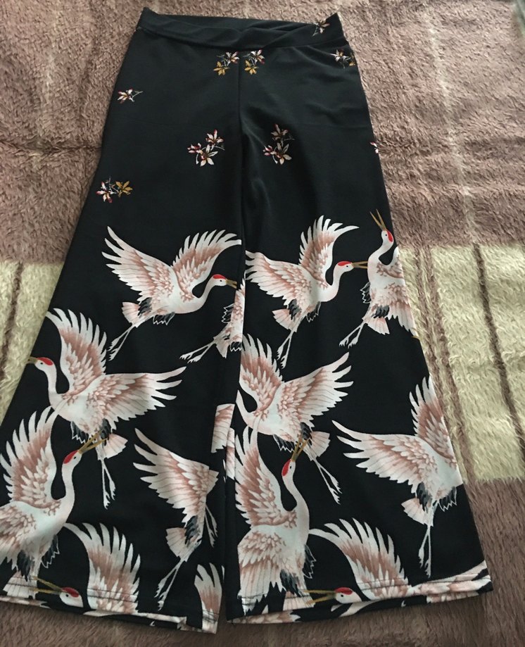 Siyah renk üzerinde leylek desenli yazlık pantolon.