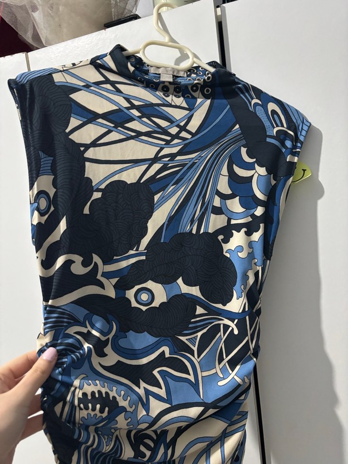 Yüksek yakalı, kolsuz ve drapeli tasarıma sahip, desenli koyu mavi midi uzunluğunda şık bir elbise. Sokak stiline uygun ve vücuda oturan kesim.