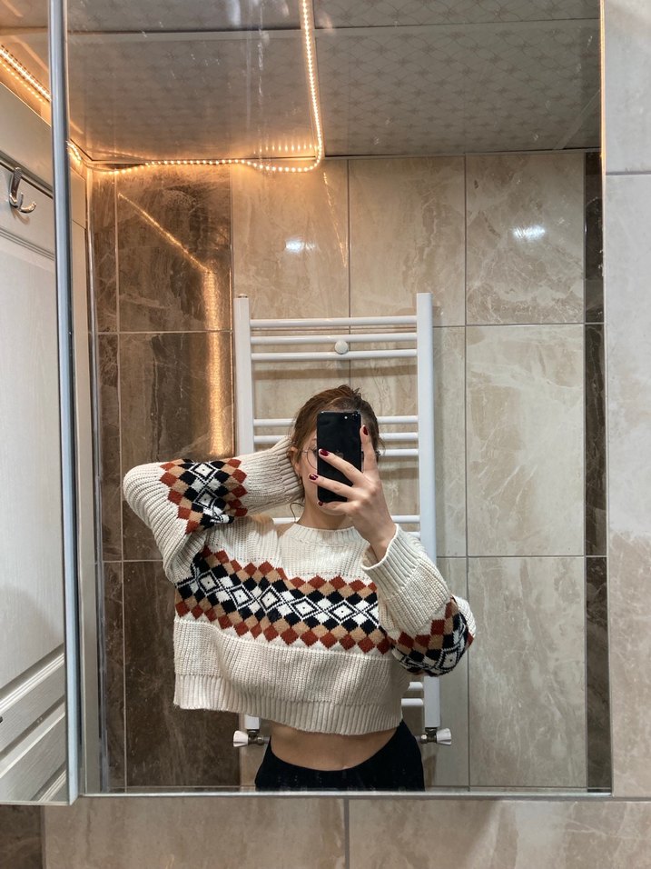 Bohem tarzı desenlere sahip, yüksek yakalı ve uzun kollu, rahat kesim örgü kazak. çok az giydim yeni gibi m bedene kadar uygundur