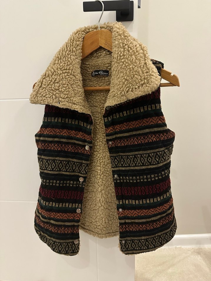 S beden yünlü, desenli ve kürklü detaylı, bohem tarzda yüksek yakalı, kolsuz ve normal boyda fitted yelek. Günlük kullanıma uygundur.