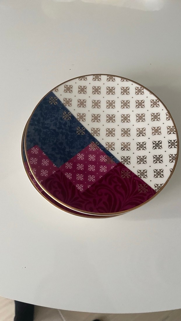 Yuvarlak, çok renkli desenli kapaklı, koyu mavi, bordo ve beyaz bölümlü saklama kabı, altın detaylarla süslenmiştir.