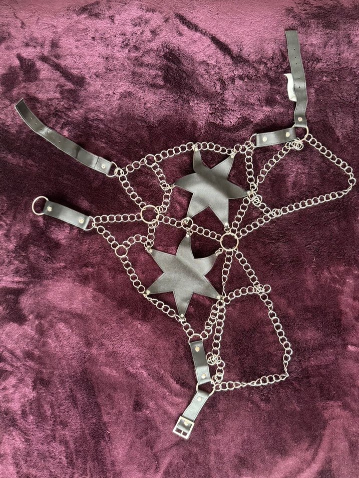 Zincir detaylı, yıldız figürlü kadın vücut zinciri. Gotik punk tarzı ve parti için uygun. Boyn kısmında askıyı sabitlemek için sıkıştırılan aparatı yok