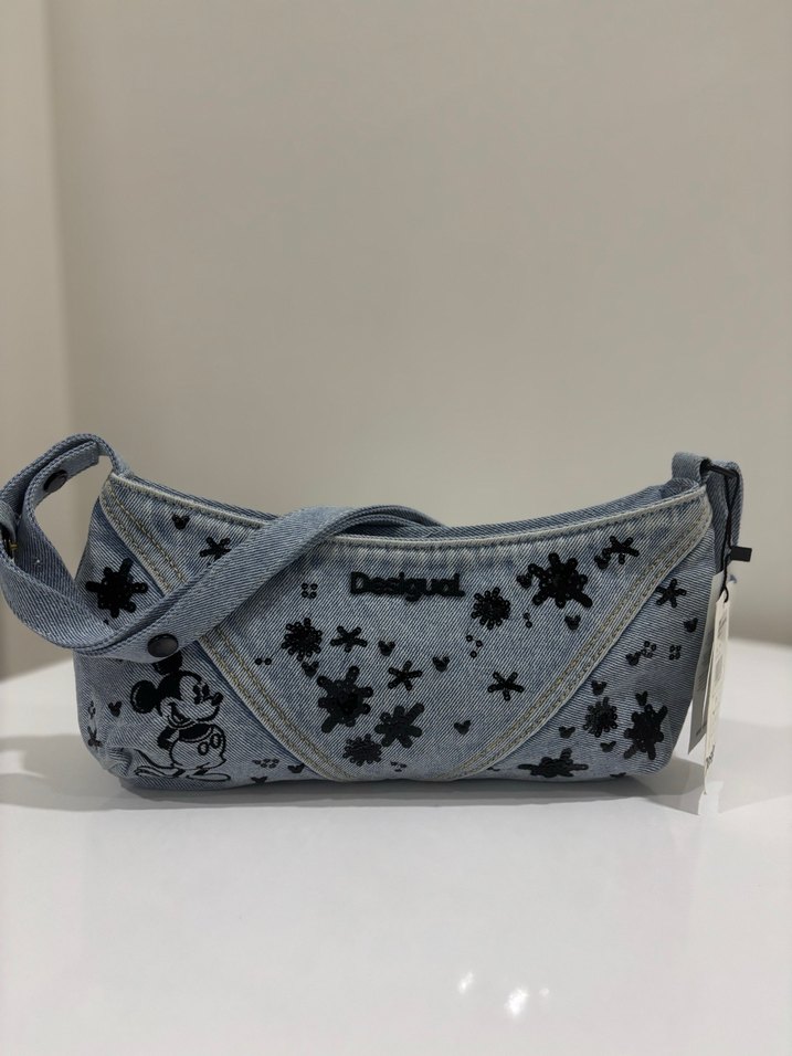 Desigual marka, mavi kot kumaştan, Mickey ve çiçek baskılı, kemerli ve askılı kadın çantası. Rahat ve şık günlük kullanım için uygun. Etiketli sadece bir çıtçıtı eksik