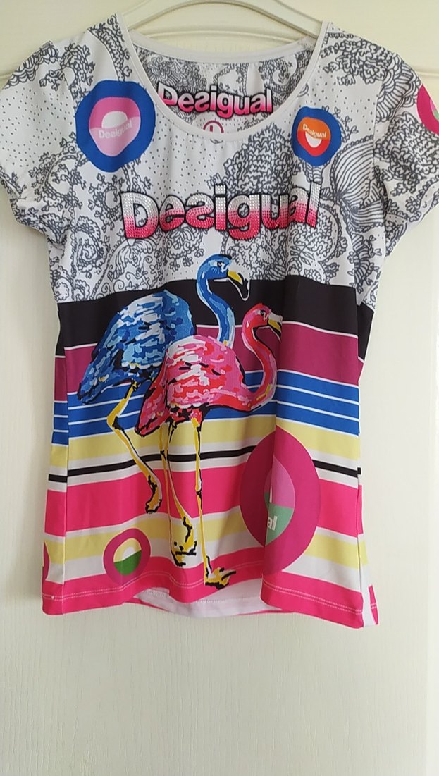 Desigual markalı, baskılı flamingo desenli, kısa kollu, bisiklet yaka, renkli ve mini uzunlukta tişört.