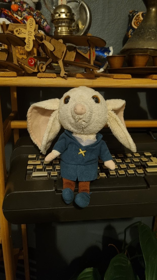 Mavi kıyafetli, kahverengi pantolonlu ve büyük kulaklı gri pastel peluş fare oyuncak.