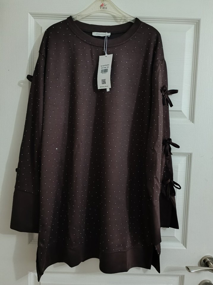 Bol kesim, uzun kollu kahverengi tunik. Yuvarlak yaka ve taşlı detaylara sahip. Yanlarda fiyonklar ve midi boy rahat kesim.