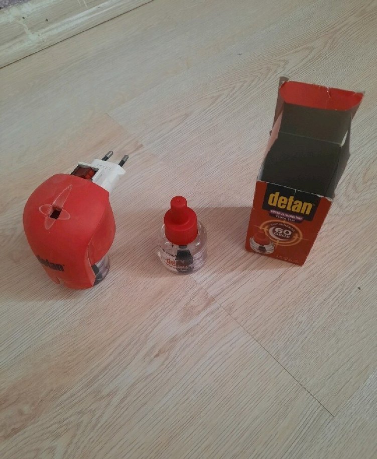 Detan kırmızı elektrikli böcek ilacı makinesi ve yedek şişesi, prize takılarak kullanılır.Cihaz en fazla bir hafta kullanıldı. Evimde sivrisinek olmadığı için ihtiyaç hissetmedim. Yedek likit ise hiç kullanılmadı.
