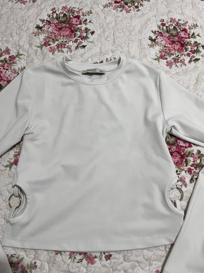detaylı, bisiklet yaka ve uzun kollu kız bluzu. Düz beyaz, sentetik kumaştan yapılmıştır ve bel kısmında zarif süslemelere sahiptir.