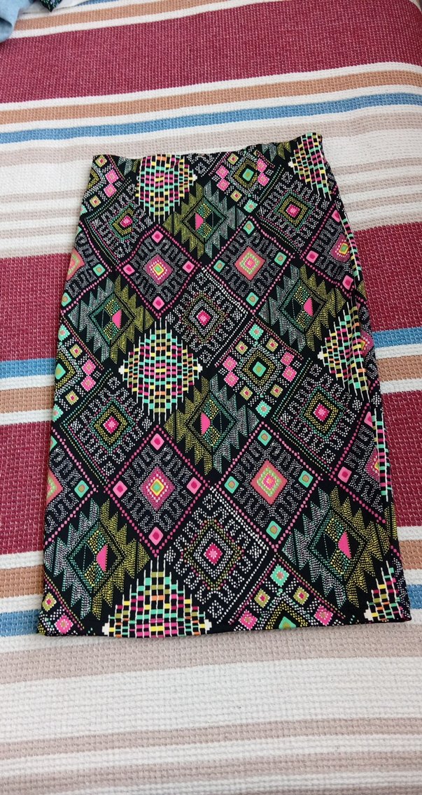 koyu renkli çok renkli desenlere sahip uzun, kalem kesim etek. Sentetik kumaştan yapılmıştır ve bohem tarzına uygundur.