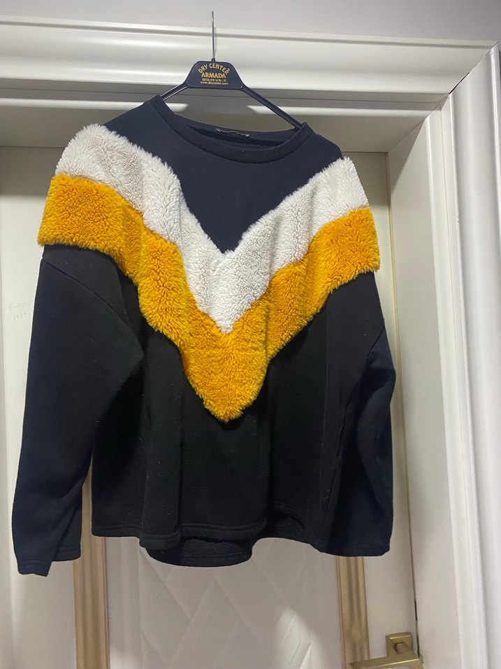 Uzun kollu, yuvarlak yakalı kadın sweatshirt, sarı ve beyaz peluş detaylarla desenli. Rahat ve bol kesim, gündelik kullanıma uygun.