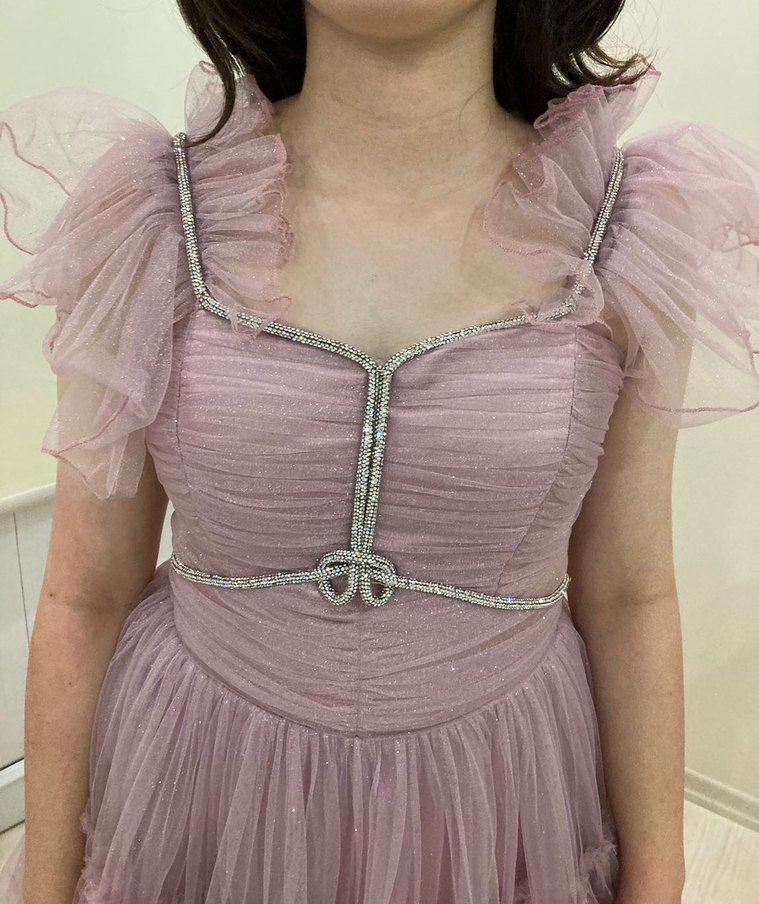 V yaka ve askılı kol detayına sahip, zincir süslemeli pembe midi abiye elbise, şık ve bohem tarzı yansıtıyor. 12-13-14-15 yaş için uygundur sadece bir kere giyildi hiçbir defosu yok. Aklınızdakiler için sorabilirsiniz
