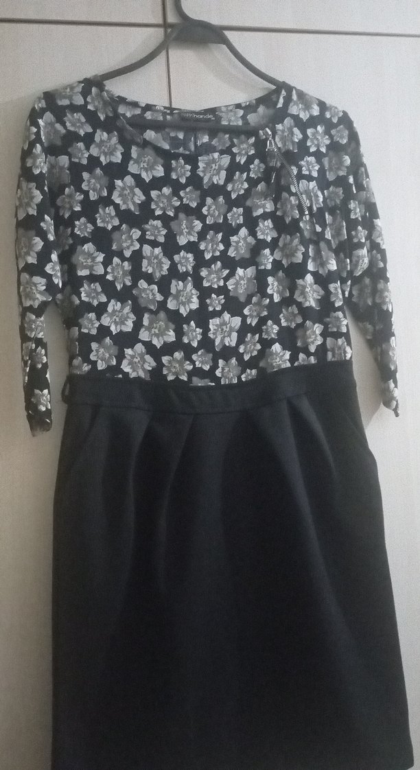 Uzun kollu, dantel çiçek desenli siyah midi elbise, bol kesim ve yuvarlak yaka ile ofis kullanımı için uygundur.