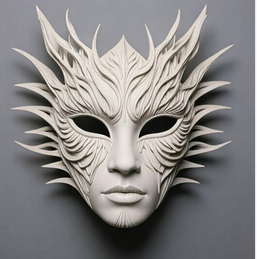 Alev desenli detaylı yüz maskesi, tüm yüzü kaplayan keskin hatlar ve dokularla dikkat çekici bir görünüm sunar.