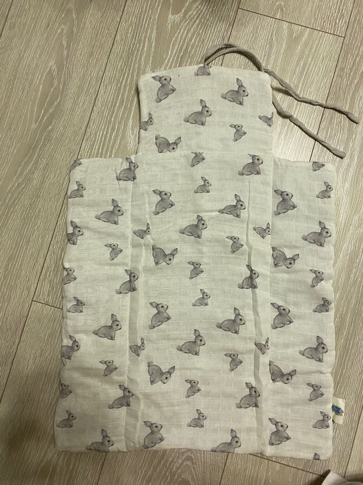 Baskılı tavşan desenli gri keten çocuk uyku minderi, yumuşak ve nefes alabilir kumaştan üretilmiştir.