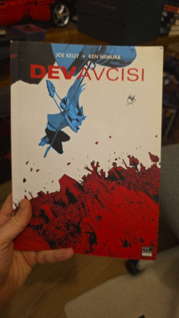 Joe Kelly ve Ken Niimura imzalı "Deva Avcısı" romanı, mavi bir figürün mızrak tuttuğu, kırmızı ve beyaz arka planlı etkileyici kapak tasarımıyla dikkat çekiyor.