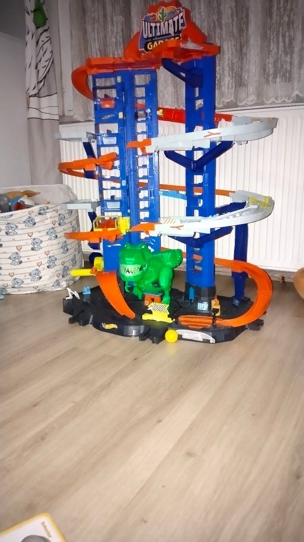 Renkli, çok katlı oyuncak araba park yeri, rampalar ve yeşil dinozor figürü içerir. Arabaların yukarı ve aşağı hareket ettiği katlar bulunur. ️