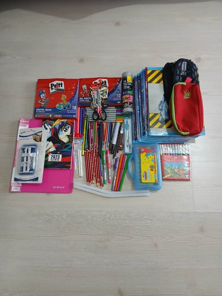 elybaby 2 adet çekmece kilidi maped 1 adet makas sensoft 3D fluo 13.5cm 17 adet mopak a4 defter genellikle 40 sayfa üç beş tanesi daha az sayfa sayısına sahip çizgisiz boş Defterler 2 adet kalın silikon 1 adet sıfır globox 30lu a4 sunum dosyası 1 adet mikro marka kalemlik 1 adet markasını bilmediğim 1 fermuar ucu kopuk kalemlik 10 adet kuru kalem 8 adet keçeli kalem 11 adet kırmızı kalem 8 adet fineliner 3 adet fırça 3 adet fosforlu kalem 1 adet H kurşun kalem 1 adet 2B Kurşun Kalem 1 adet edding tahta kalemi (yazmıyor) 1 adet maped gom pen silgi 1 adet fosforlu ve edding harici hepsi yazıyor karışık pastel boyalar kuru boyalar ve keçeli boyalar vardır durumları görselde belirtilmiştir #kırtasiye #okul #kırtasiyeseti #kalem #defter #boya #pritt #fabercastell #maped #globox #okulhazırlığı #öğrenci #ucuz #uygunfiyat #fırsat #ikinciel #gardrops #kırtasiyeaşkı #boyakalemi #pastelboya #ajanda #dosya #evveyaşam #çekmecekilidi #silikon #hızlısatış #temizürün #toplusatış