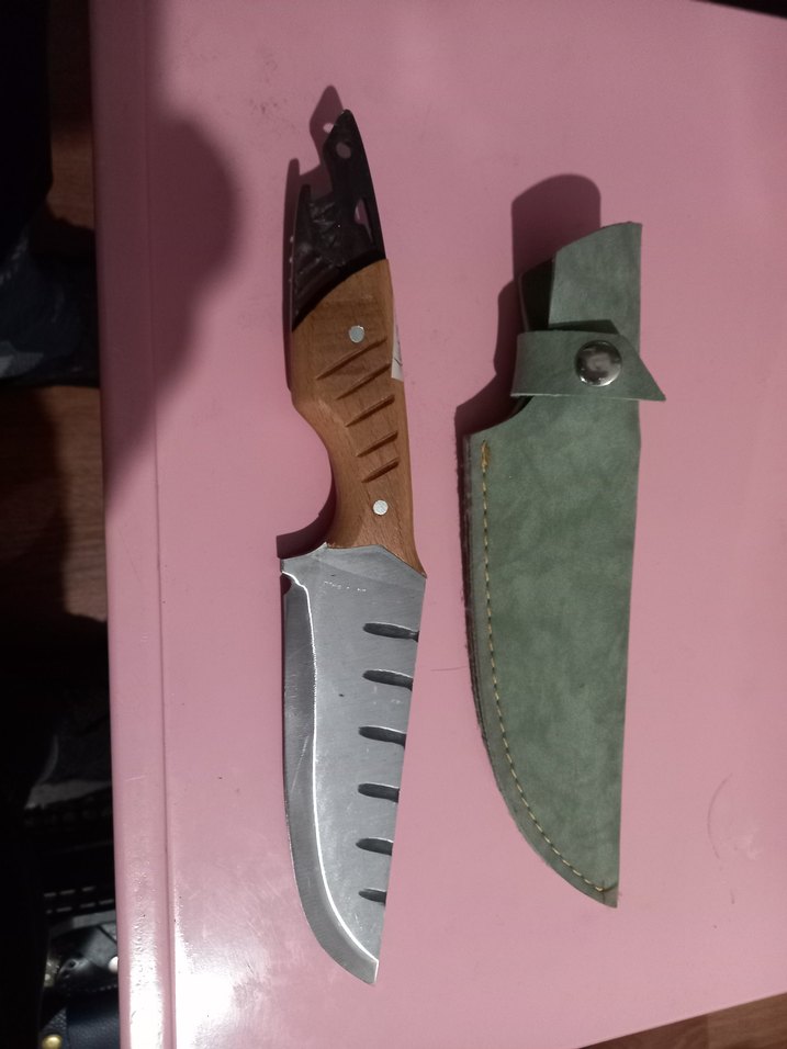 Ahşap saplı gri renkte bıçak ve yumuşak dokulu yeşil kılıf. Bıçağın üzerinde keskinlik için oyuklar bulunur.