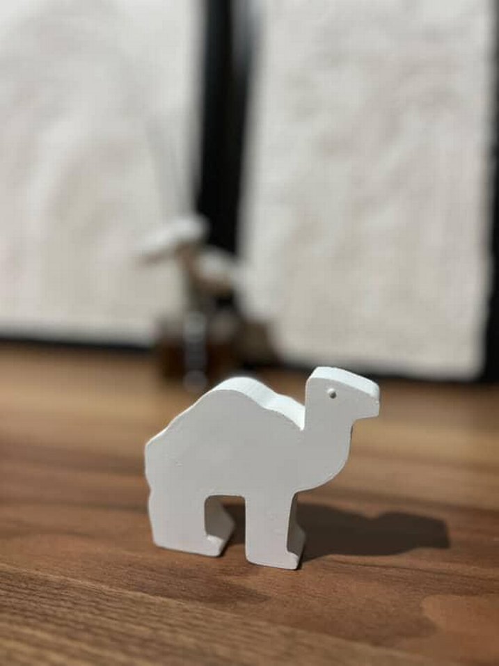 Düz yüzeyli, küçük deve figürü, dekoratif amaçlı kullanıma uygun.