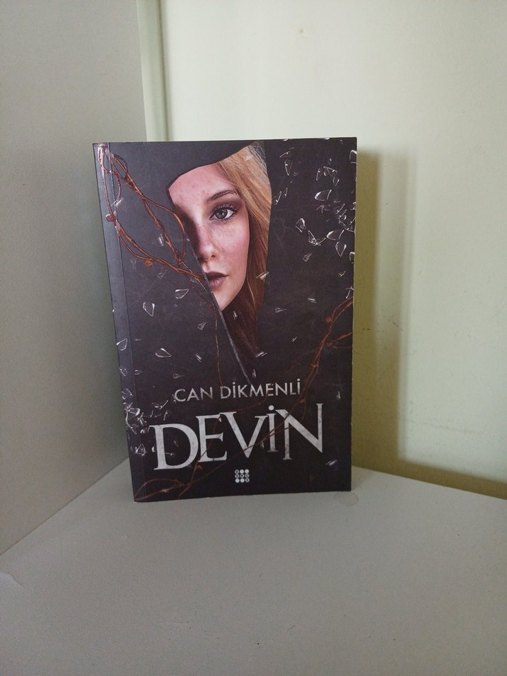Can Dikmenli'nin "Devin" adlı romanı, kırılmış camın ardında kısmen görünen bir kadının yüzünü gösteren dikkat çekici kapağa sahip.