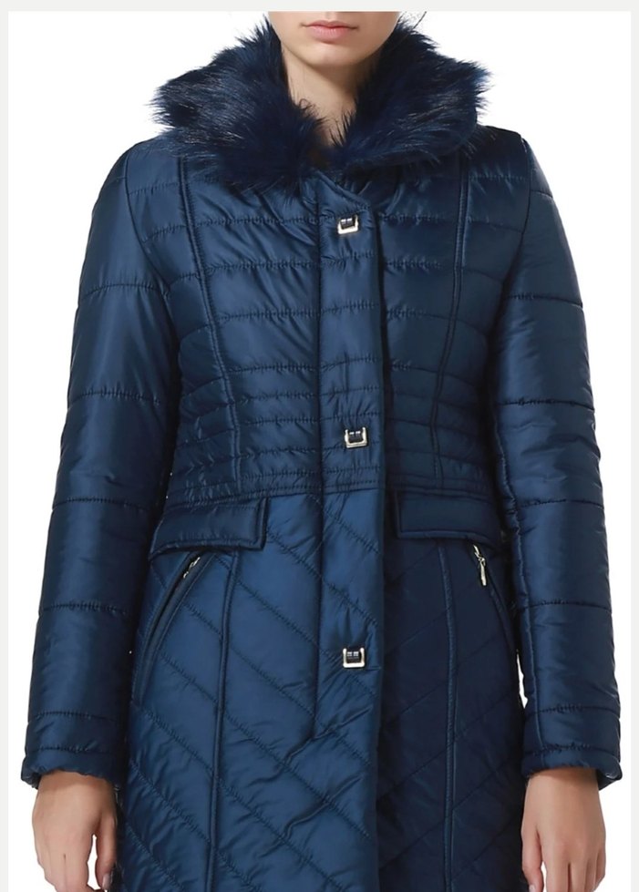 Lacivert, kürklü yakalı, strappy kollu, parlak yüzeyli, midi boy, sentetik kumaş kadın kaban. Ofis için uygun, şık ve rahat bir model. ❄️