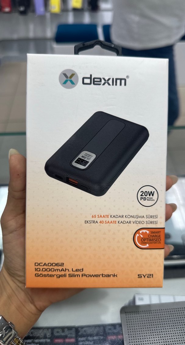 Dexim siyah slim powerbank, 10.000mAh kapasite ve LED göstergeye sahiptir. 20W PD hızlı şarj desteği ile 65 saate kadar konuşma ve 40 saate kadar video süresi sağlar.