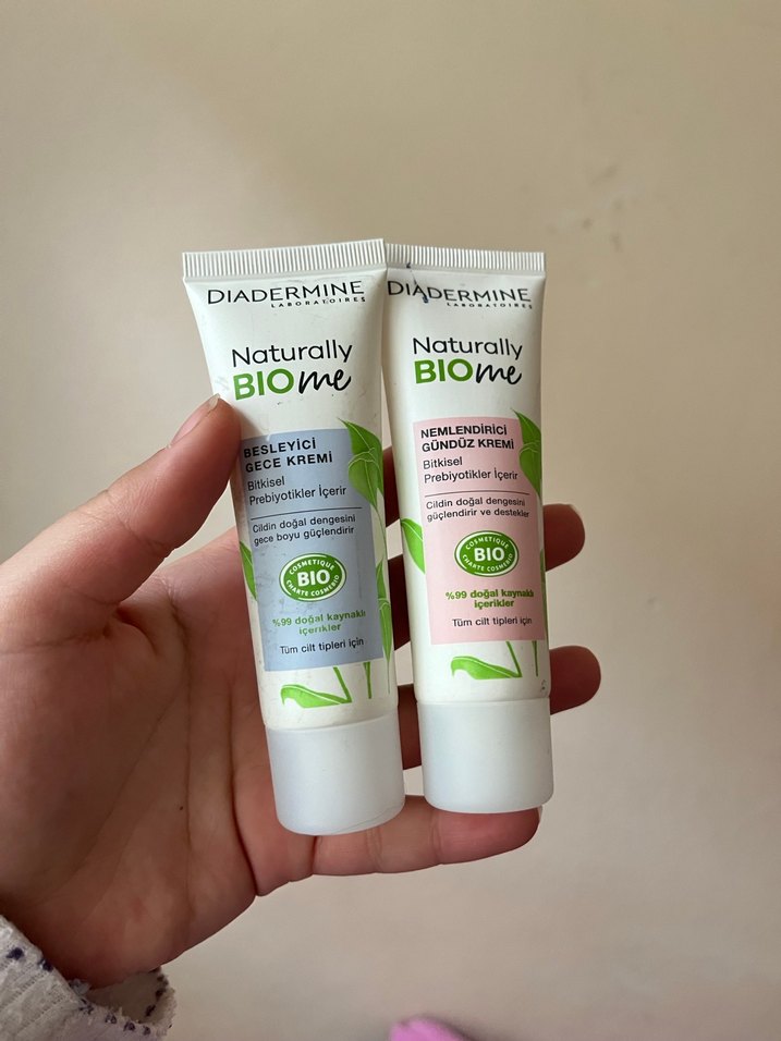 Diadermine Naturally BIOME besleyici gece kremi ve nemlendirici gündüz kremi, cilt dengesini destekleyen %9,9 doğal içerik ve prebiyotikler içerir. Tüm cilt tipleri için uygundur.