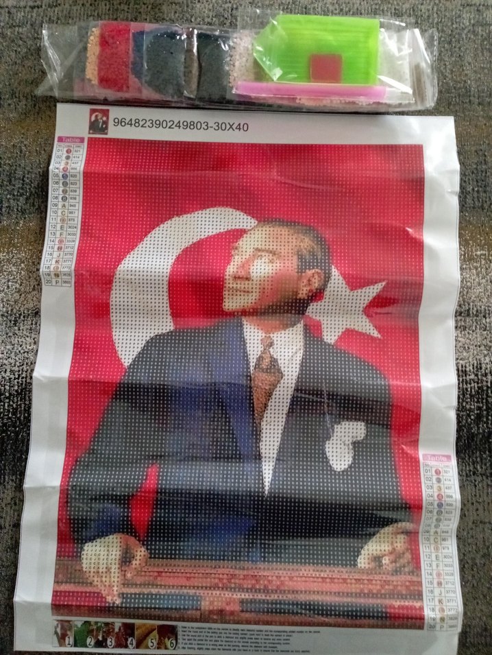 30x40 cm boyutlarında, Türk bayrağı fonlu Atatürk resmi içeren, canlı renkli parçalar ve montaj araçları ile 5d ELMAS BOYAMA seti.kalemi,tabağı, renkli taslari ve yapışkan mum içerisindedir