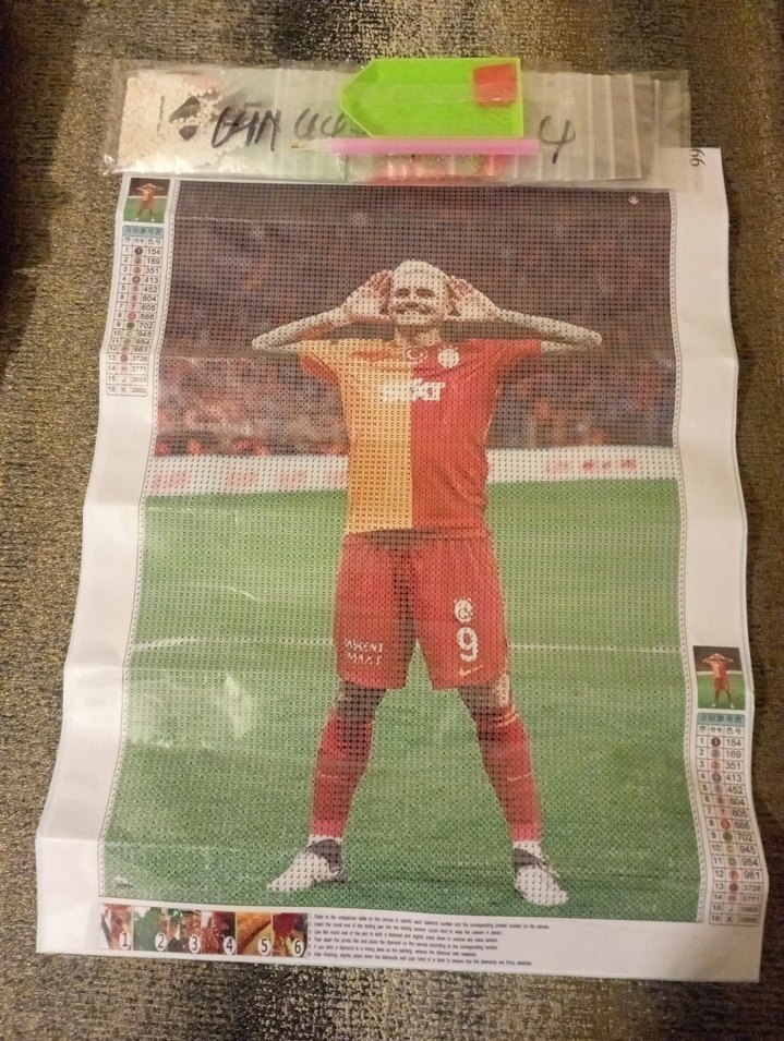 Galatasaray futbolcusunun sahada kutlama yaptığı el yapımı mozaik seti. Set, resmi tamamlamak için gereken tüm malzemeleri içerir. ⚽