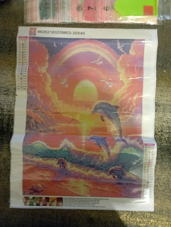 gün batımı önünde zıplayan yunusları gösterir. 30x40 cm boyutunda ve detaylı canlı rekleriyle 5d elmas boyama seti.kalemi,tabağı,renkli taşları ve yapışkan mum içerisindedir.
