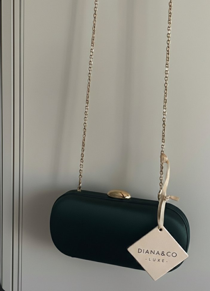 Diana&Co koyu yeşil portföy çanta, zincirleri çıkarılabilir, çantanın eni 20cm derinliği yaklaşık 8-9,5 cm dir, zincirlerin uzunluğu yaklaşık 58cm dir. kendi saten pembe bezi ile birlikte gönderilecektir (fotoğraftaki beyaz bez ile poşet de dahil)