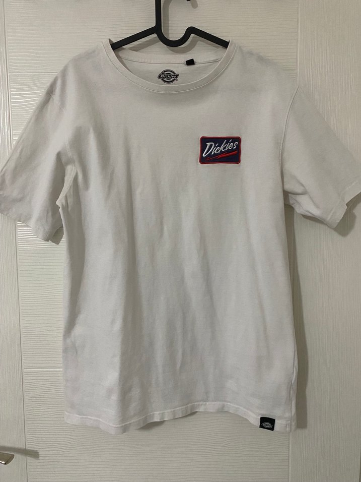 Dickies marka, pamuklu, kısa kollu, beyaz tişört. Baskılı logo detayıyla günlük rahat stil sunar.