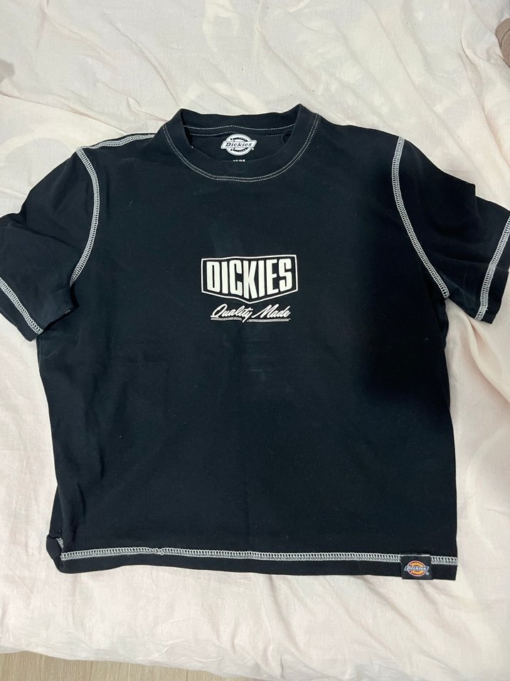 Dickies markalı, parlak siyah denim kumaştan, kısa kollu, bisiklet yaka ve baskılı logolu, rock punk tarzı erkek çocuk tişörtü.