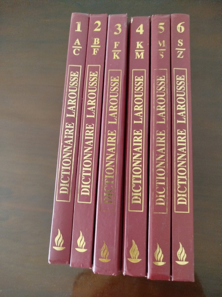 Altı ciltlik Dictionnaire Larousse seti, farklı harf aralıklarını kapsar. Kitaplar bordo kapaklı ve altın yazılıdır.
