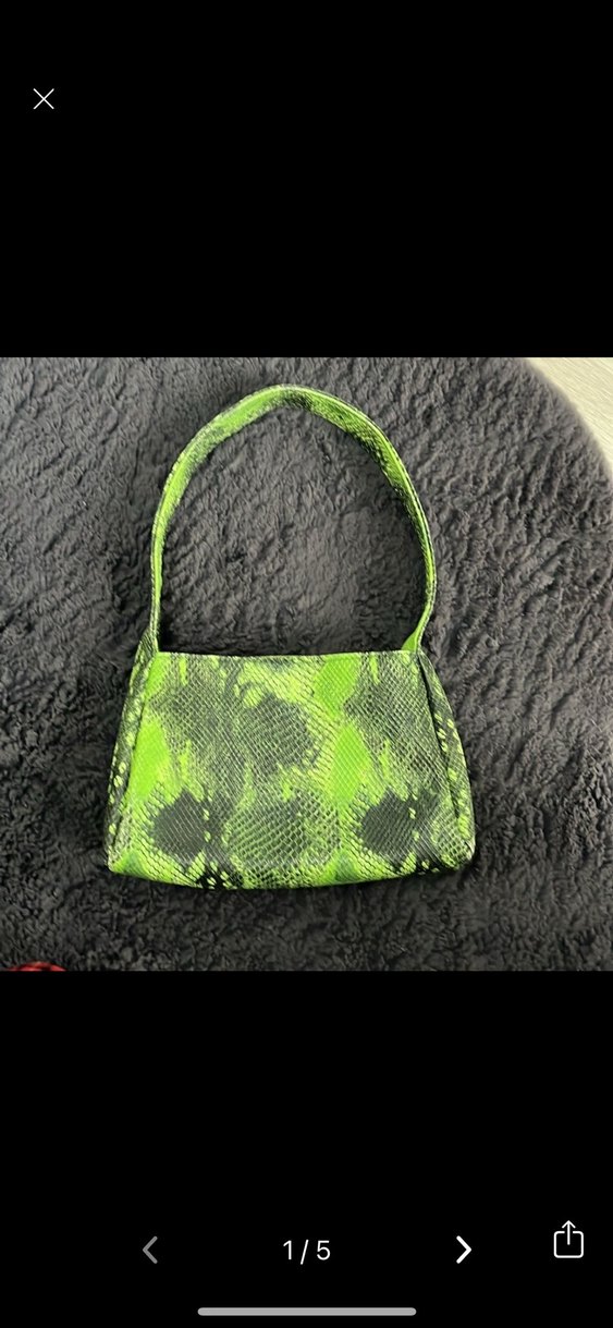 Yeşil renkli, parlak yılan desenli ve fermuarlı sentetik kumaştan yapılmış çanta. Avant-garde sokak stili ve dış mekan kullanımı için uygundur. Hediye geldi kullanılmadı