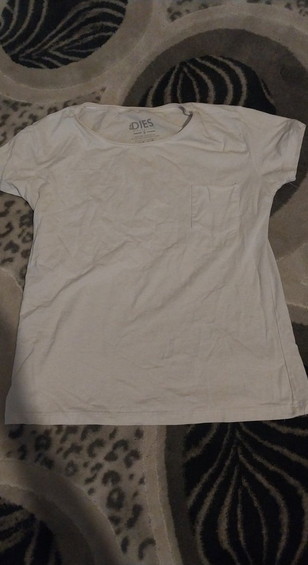 DIES markalı beyaz kadın tişörtü, yuvarlak yaka ve kısa kolludur. Pamuklu kumaştan, rahat kesim ve küçük göğüs cebine sahiptir. Günlük sokak stili için uygundur.