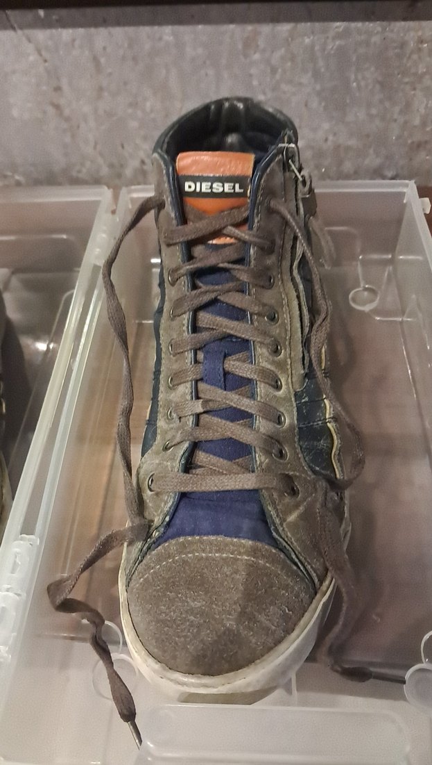 Kahverengi Diesel erkek spor ayakkabısı, gri detaylı ve kahverengi bağcıklı, sokak tarzı tasarım ve Diesel logosu ile.
