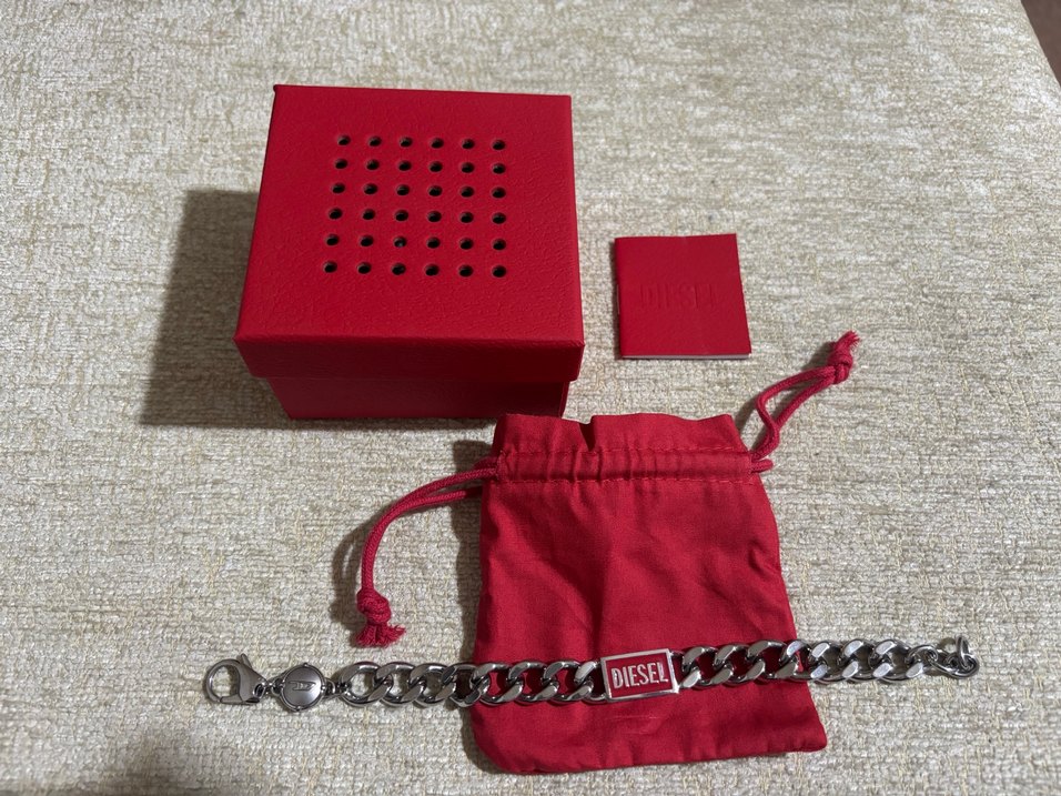 Diesel erkek çelik bileklik, kırmızı zincir ve gri Diesel logo plakasıyla. Kırmızı kese ve kutu ile birlikte gelir. Orijinal faturalı garantili
