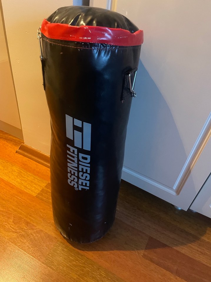 Diesel Fitness marka deri boks torbası, kemerli kırmızı-siyah tasarıma sahip ve baskılı logo içerir. Athleisure tarzı için uygundur.