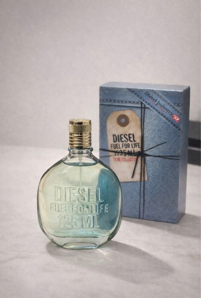 Diesel Fuel for Life erkek parfümü, 125 ml şişede, pastel mavi tonlarında ve vintage tarzda tasarlanmıştır. Kokusu kontrakültür stilini yansıtır.