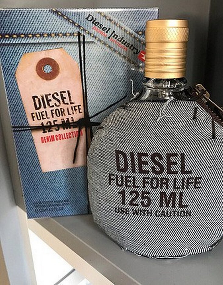 Gri denim kumaş kaplı, altın renk kapaklı 125 ml Diesel Fuel for Life erkek parfümü. Denim Koleksiyonu'ndan.