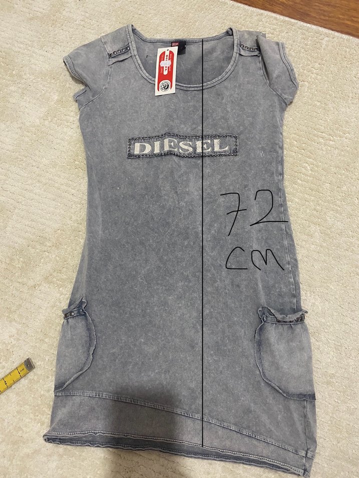Gri denim kumaştan yapılmış, baskılı Diesel logosu ve fermuarlı cepleri bulunan, kısa kollu ve vücuda oturan günlük elbise.