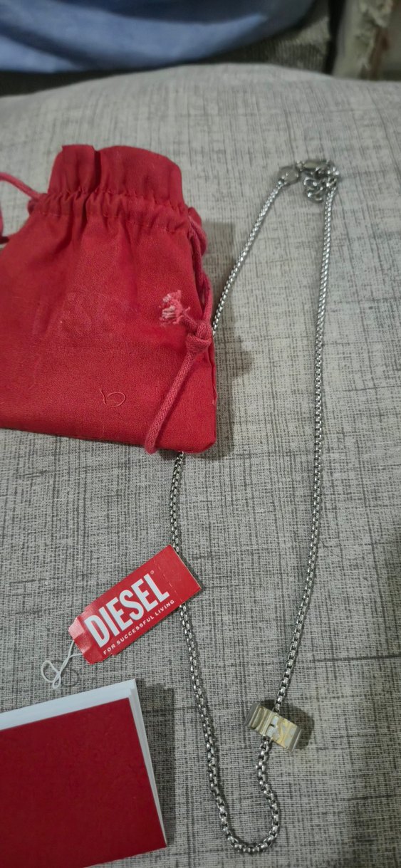 Diesel markalı gri erkek kolye, şık zincir ve kırmızı kese ile sokak stili ve günlük tarzı bir araya getiriyor. Takma amaçlı açtım ama boynuma kısa geldiği için satıyorum sertifikası ve faturası var ama başka bileklik aldığım için vermiyorum bunu bilerek alımını yaparsanız. En ufak çizik yoktur faturasını ayrı çıkarabilirsem yanında gönderme şansım olur teklif veripte oyalamayın Herkesin işi gücü var