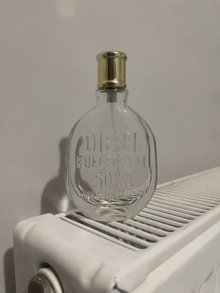 Parlak bej renkli, vintage ve karşı kültür tarzında Diesel erkek parfümü. 50 ml şişe, altın kapaklı. Orijinal Boş şişe koleksiyon için