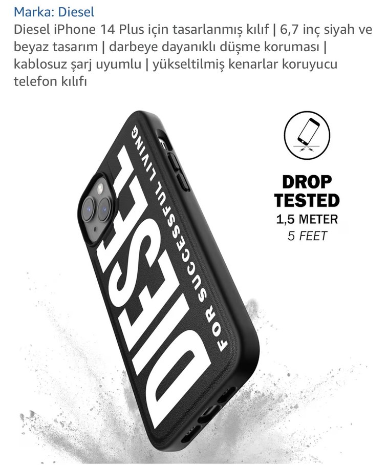 Diesel marka, iPhone 14 Plus 6,7 inç için tasarlanmış siyah telefon kılıfı. 1,5 metre düşme koruması ve yükseltilmiş kenarları ile darbeye dayanıklı. Kablosuz şarj uyumlu.